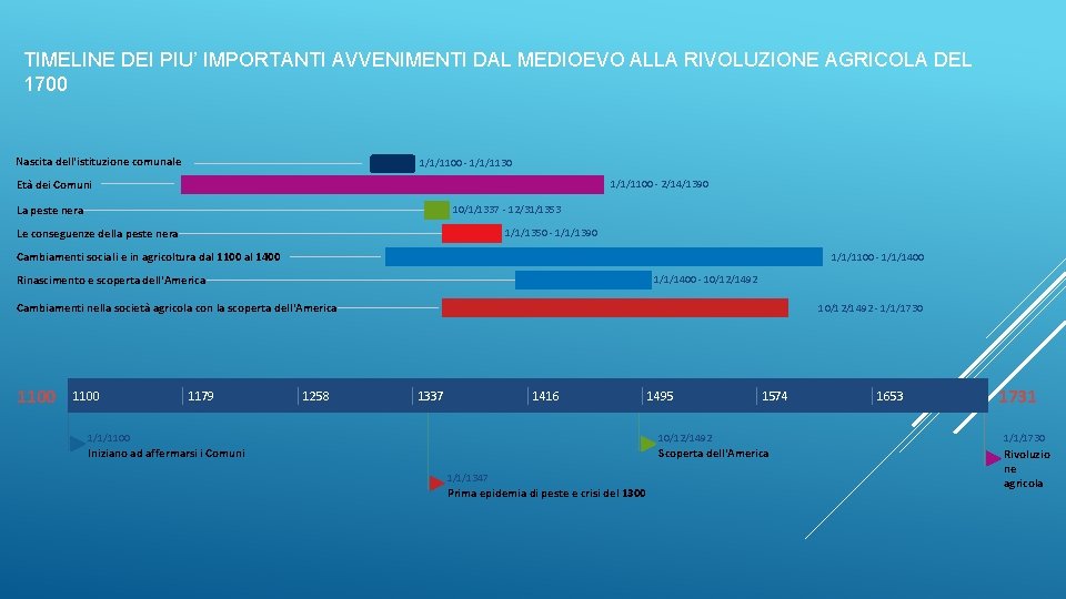 TIMELINE DEI PIU’ IMPORTANTI AVVENIMENTI DAL MEDIOEVO ALLA RIVOLUZIONE AGRICOLA DEL 1700 Nascita dell'istituzione comunale 1/1/1100 - 1/1/1130 1/1/1100 - 2/14/1390 Età dei Comuni La peste nera 10/1/1337 - 12/31/1353 Le conseguenze della peste nera 1/1/1350 - 1/1/1390 Cambiamenti sociali e in agricoltura dal 1100 al 1400 1/1/1100 - 1/1/1400 Rinascimento e scoperta dell'America 1/1/1400 - 10/12/1492 Cambiamenti nella società agricola con la scoperta dell'America 1100 1179 1258 10/12/1492 - 1/1/1730 1337 1416 1495 1574 1653 1731 1/1/1100 10/12/1492 1/1/1730 Iniziano ad affermarsi i Comuni Scoperta dell'America Rivoluzio ne agricola 1/1/1347 Prima epidemia di peste e crisi del 1300
