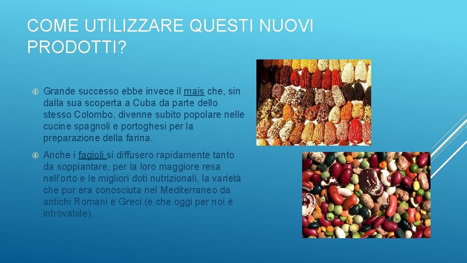 COME UTILIZZARE QUESTI NUOVI PRODOTTI? Grande successo ebbe invece il mais che, sin dalla sua scoperta a Cuba da parte dello stesso Colombo, divenne subito popolare nelle cucine spagnoli e portoghesi per la preparazione della farina. Anche i fagioli si diffusero rapidamente tanto da soppiantare, per la loro maggiore resa nell’orto e le migliori doti nutrizionali, la varietà che pur era conosciuta nel Mediterraneo da antichi Romani e Greci (e che oggi per noi è introvabile).