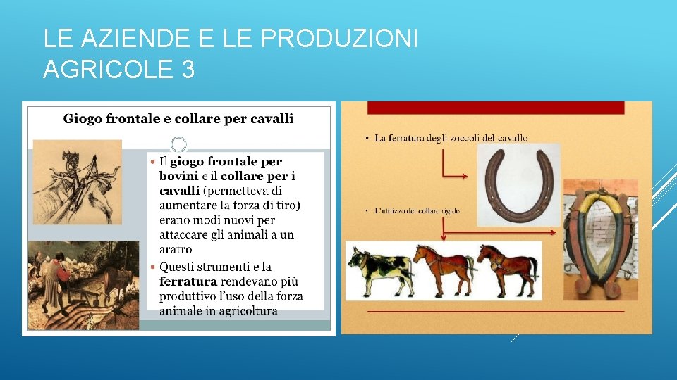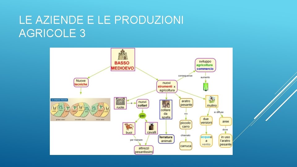 LE AZIENDE E LE PRODUZIONI AGRICOLE 2 PER QUANTO RIGUARDA GLI ALLEVAMENTI I SUINI VENGONO ALLEVATI SOPRATTUTTO IN STALLE, DATA LA RIDUZIONE DEI BOSCHI DI QUERCIE; I CAVALLI SI ALLEVANO PER IL LAVORO, IL TRASPORTO E GLI ESERCITI; I BOVINI VENGONO ALLEVATI IN PARTICOLARE PER IL LAVORO; INFINE, CRESCE FORTEMENTE L’ALLEVAMENTO DEGLI OVINI, DOVUTO ALL’AUMENTO DELLA RICHIESTA DI LANA DA PARTE DI UN ARTIGIANATO DEI TESSUTI CHE SI SVILUPPA PARTICOLARMENTE NEL NORD EUROPA (FIANDRE) E IN INGHILTERRA, CIO’ FINISCE PER CAUSARE ALCUNI PROBLEMI ALL’AGRICOLTURA PER LA SOTTRAZIONE DI TERRENI COLTIVABILI. LE TECNICHE AGRONOMICHE CONSISTONO PREVALENTEMENTE NELLA ROTAZIONE TRIENNALE: CEREALI-FORAGGI-LEGUMI