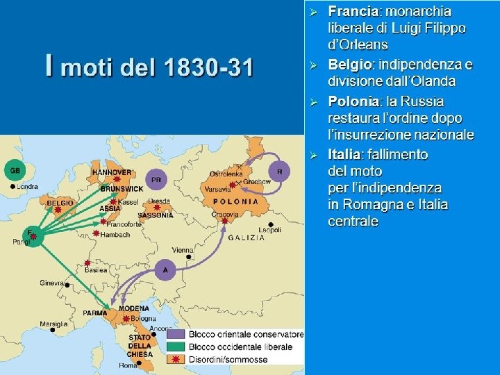 LIBERALI E ASSOLUTISTI �Il successo dei moti del 1830 in Belgio e a Parigi crea una divisione in Europa: - paesi occidentali → liberalismo, prevale la borghesia - paesi orientali (Austria, Prussia, Russia) → assolutismo, esigenza dell’indipendenza dei popoli �La Gran Bretagna, scontenta dei metodi repressivi della Quadruplice Alleanza, se ne allontana e si avvicina alla Francia.