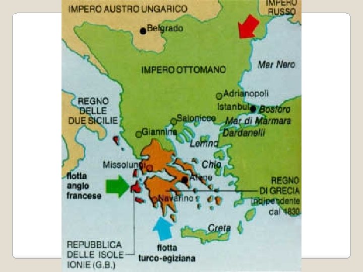 L’INDIPENDENZA GRECA �Società � 1821: segreta Eteria inizio Ottomano rivolta contro l’Impero �Aiuti da Francia, Gran Bretagna e Russia, interessate ad indebolire gli ottomani � 1829: pace di Adrianopoli → Grecia indipendente