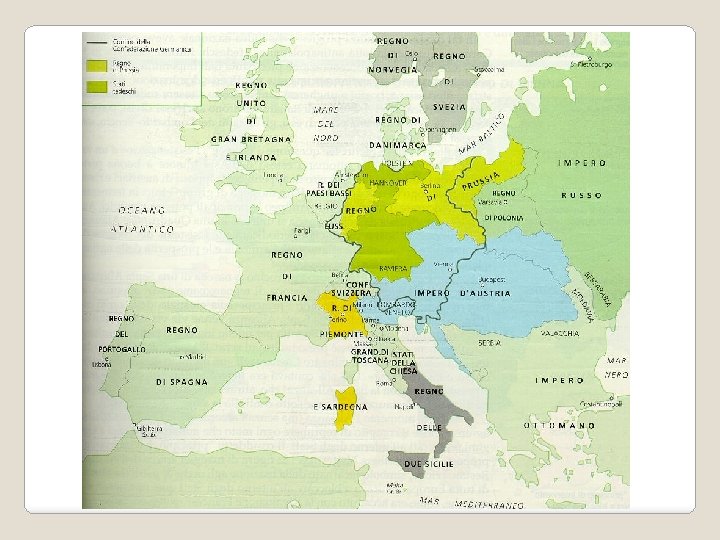IL NUOVO ASSETTO EUROPEO � La Russia si estende verso ovest, inglobando anche parte della Polonia e la Finlandia � La Prussia acquisisce parte della Sassonia e della zona del Reno � L’Austria ottiene la Dalmazia e riconferma il possesso su Lombardia e Veneto. Grazie alleanze con gli altri stati italiani, ha l’egemonia sulla penisola (solo il Regno di Sardegna mantiene una certa autonomia) � La Svezia ingloba la Norvegia � Si creano due nuovi stati: la Confederazione Germanica (39 piccoli stati), presieduta dall’imperatore d’Austria e il Regno dei Paesi Bassi (Belgio+ Olanda) � La Gran Bretagna acquista nuove colonie � Il Portogallo rimane temporaneamente sotto il controllo inglese, perché la dinastia legittima si è rifugiata in Brasile durante l’Età Napoleonica.