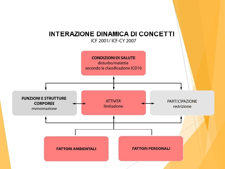 La «condizione» di salute • È la risultante dell’interazione tra aspetti biomedici e psicologici della persona (funzioni e strutture corporee); • aspetti sociali (attività e tipo di partecipazione svolte nella quotidianità); • fattori di contesto (fattori ambientali e personali) I fattori personali come l’autostima, la motivazione individuale, sono presi in considerazione dall’ICF, ma non sono classificati in quanto non facilmente identificabili