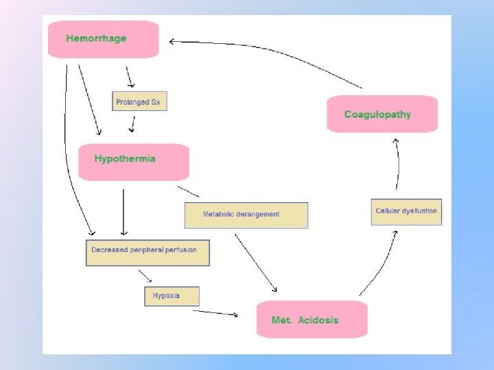 Trauma triad of death �Massive haemorrhage lead to � Hypothermia � Metabolic acidosis � Coagulopathy