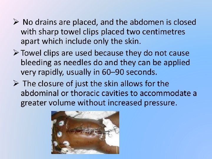 Principles of damage control Surgery �Rapid closure of abdomen �Opening abdomen for long period leads to loss of heat and fluid �Concomitant thoracic opening aggravates it �Break the viscous cycle of lethal triad and restore physiology