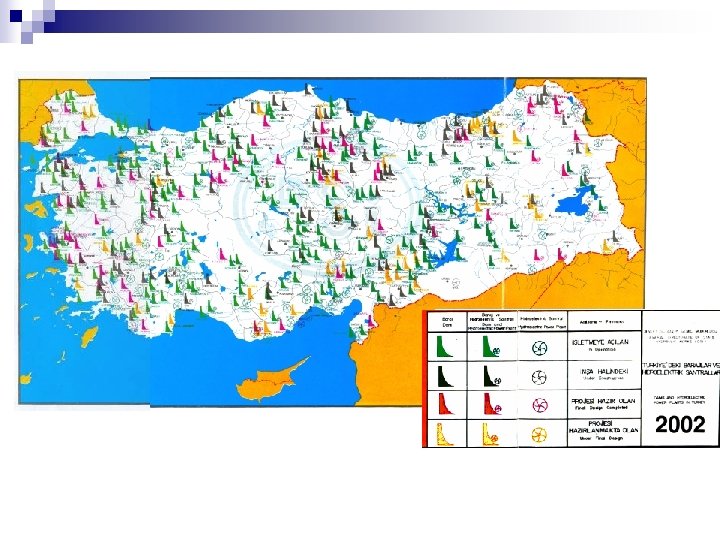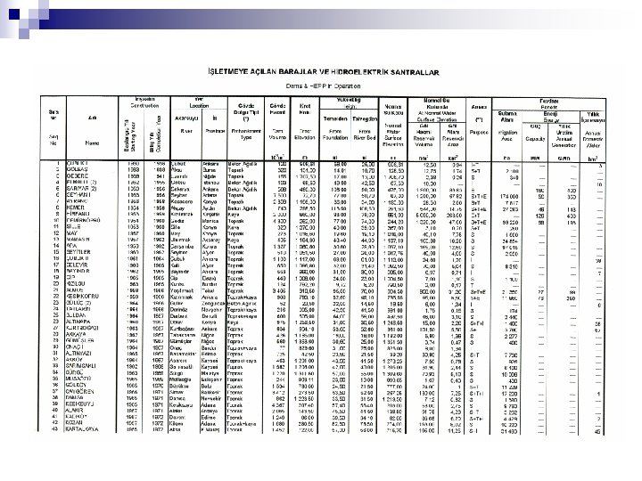 n In Turkey, 536 large dams have been built and being operated. On the other hand, Small Hydraulic Works Department has built 42 small dams. n Here, 50 storage facilities that are not considered as dam due to their low heights (<15 m) and low storage capatcities (<2 hm 3) have not been taken into account. n By now, construction of 100 dams and hydroelectric powerplants is going on.