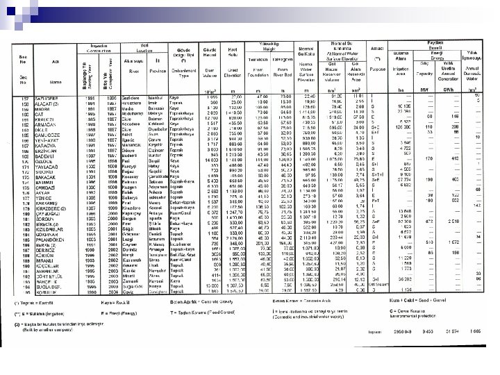 n n n n n River side. . . . . nehir içi Butress. . . . . payanda Foundation. . . . . temel Embankment. . . . sedde Base-width. . . . . taban genişliği Crest. . . tepe Cut-off trench. . . . saplama hendeği Expansion joint. . . . genişleme derzi (dilatasyon) Spillway. . . . . dolusavak Gravity dam. . . . ağırlık barajı Tail water. . . . . çıkan su Head water. . . . . giren su Arch dam. . . . . kemer baraj Abutment. . . . . yan dayanak Multiple arch dam. . . çok kemerli baraj veya payandalı baraj Extrados. . . . . dış yüzey Intrados. . . . . iç yüzey