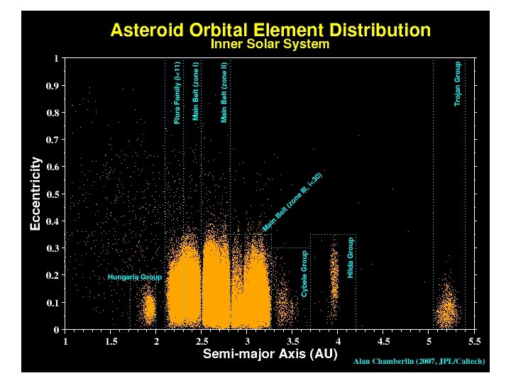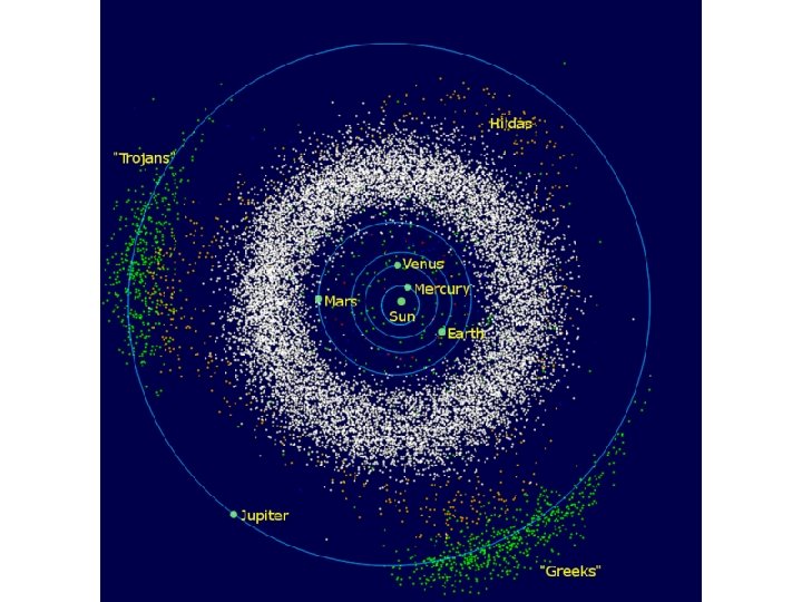 Hildas all have about same Period (2/3 that of Jupiter) Objects with a slightly different periods would not be in resonance with Jupiter. These objects would soon happen to get close to Jupiter and be scattered out of their orbits. Hildas are in a protective resonance. They sometimes get near radius of Jupiter’s orbit, but the resonance ensures that Jupiter is someplace else in its orbit at that time!!! Hildas are Survivors!! Objects with periods a little shorter or longer have long ago been eliminated from solar system!! (that’s why there are essentially no asteroids with a values between 3. 6 and 3. 9 AU and between 4 and 5 AU)