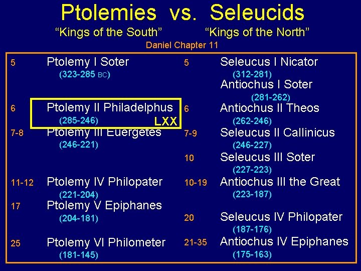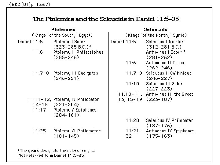 Daniel 11 1, 2 3, 4 5 -35 Persian Empire Greek, Empire Seleucid – Ptolemy Rivalry “Between the Testaments” 36 -39 40 -45 The Willful King Armageddon Scenario