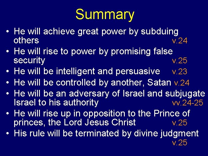Daniel 11: 1 -35 • They contain 135 Bible prophecies that have been 100 percent fulfilled. • There is no supportive evidence in history to contradict any of the 135 prophecies, i. e. , everything prophesied has come true. • They provide a convincing introduction to end-time events-a period of time in world history that is rapidly approaching. • Prophecies still to come in this chapter can be expected to be fulfilled in the same manner as the 135 prophecies were in the first thirty-five verses of Daniel chapter 11.