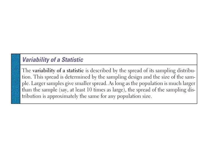 Sampling Distributions • The sampling distribution of a statistic is the distribution of values taken by the statistic in all possible samples of the same size from the same population.