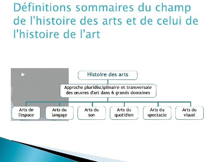 � Premières expositions universelles : la prise de conscience de l'impact des arts dans le poids emblématique des nations et de leurs concurrences politiques et économiques � Troisième République : la réforme de l'enseignement � 1925 : L'art comme dimension culturelle générale: classes de 4 e , 3 e et seconde des garçons et des filles, une nouvelle matière dite “art” ou “explication des chefs-d'œuvre de l'art”. � Réforme de 1938. La primauté est donnée à l'intelligence et au raisonnement plutôt qu'à l'accumulation des connaissances. Les méthodes actives sont recommandées.
