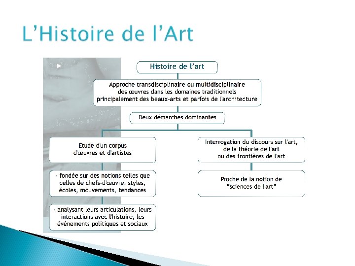 � L'histoire de l'art a pour objet, pour l'essentiel au sein de l'université, l'étude dans l'histoire des œuvres qui sont liées aux catégories traditionnelles des beaux-arts et de l'architecture, ainsi que de l'analyse du sens qu'elles peuvent prendre � L'histoire de l'art est un domaine de la recherche en sciences humaines � Elle y est majoritairement enseignée dans des départements dédiés et associés aux secteurs de l'histoire, des sciences humaines ou des lettres � Culture artistique