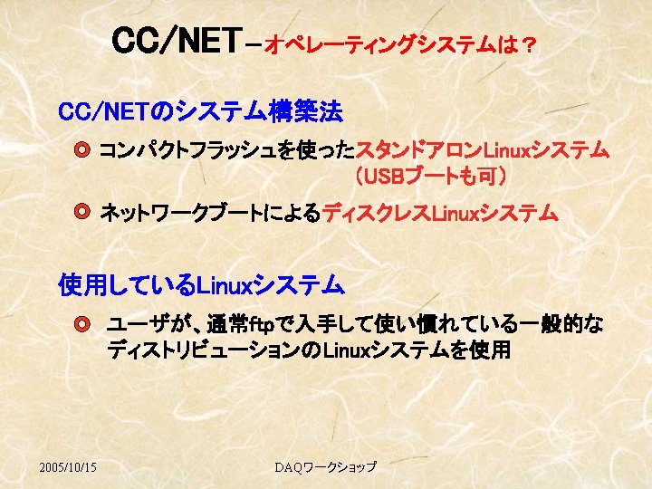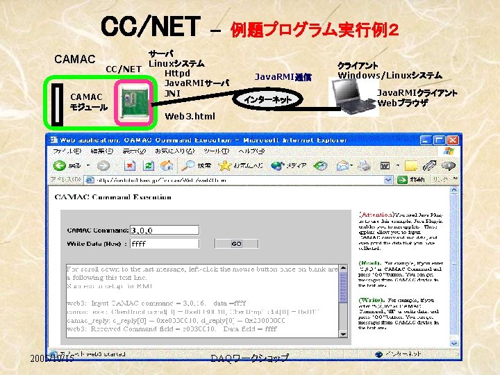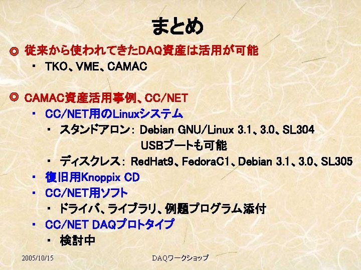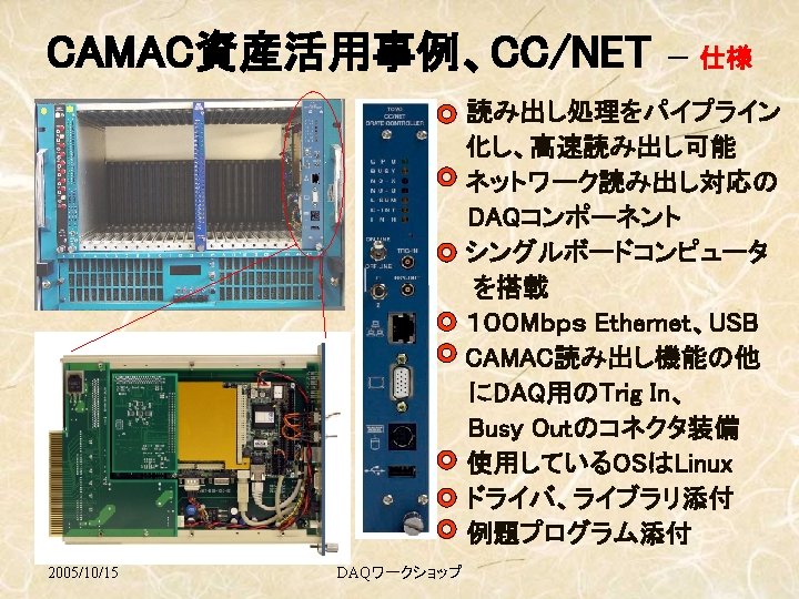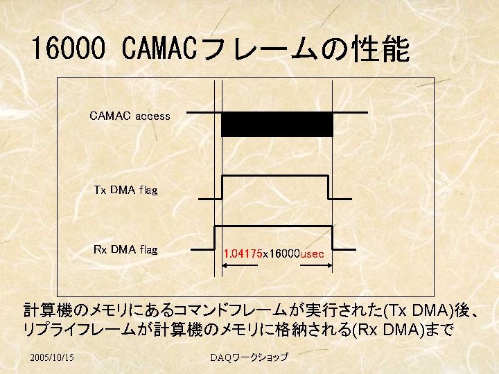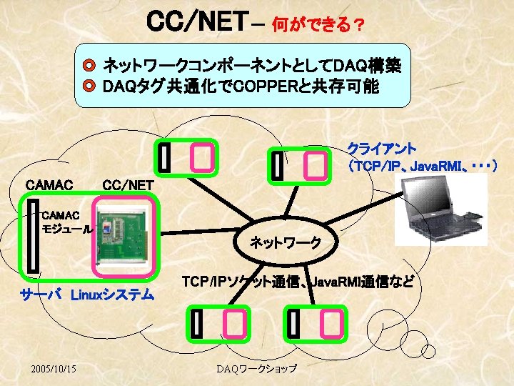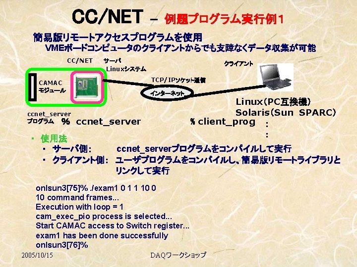 remote-CAMACの CAMACアクセス性能 Access time in usec. ACCESS TIME DMA : 2. 7 usec(~1. 1 MB/s) 2 CAMAC frames(16 bytes) took ~1. 6 usec over Fast Ethernet 1. 08 +1. 6 = ~2. 7 Overhead DMA : ~400 usec CC/NET サーバ CAMAC モジュール 2005/10/15 Data Size in bytes クライアント TCP/IPソケット通信 インターネット DAQワークショップ PC/Linux