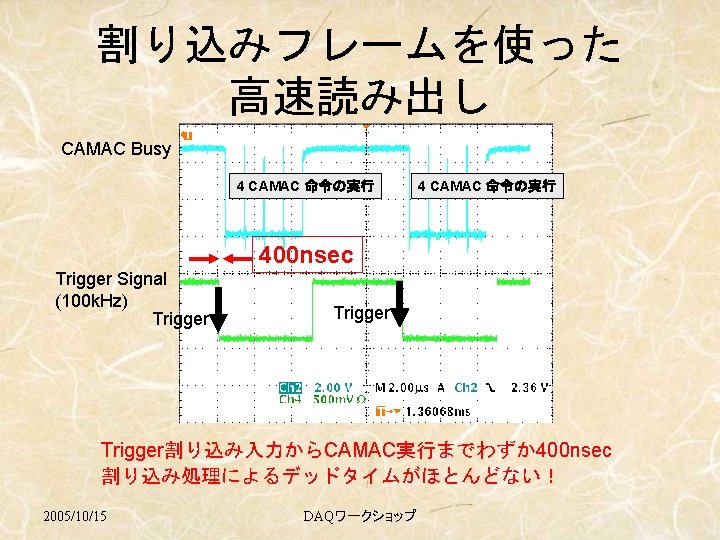 CAMACライブラリーを使った CAMACアクセスの性能 Access time in usec. ACCESS TIME PIO : 2. 67 usec(~1. 1 MB/s) DMA: 1. 08 usec(~2. 8 MB/s) PIO DMA Data Size in frames Cross point : ~15 frames 2005/10/15 Data Size in frames DAQワークショップ Overhead PIO : ~6 usec DMA: ~30 usec
