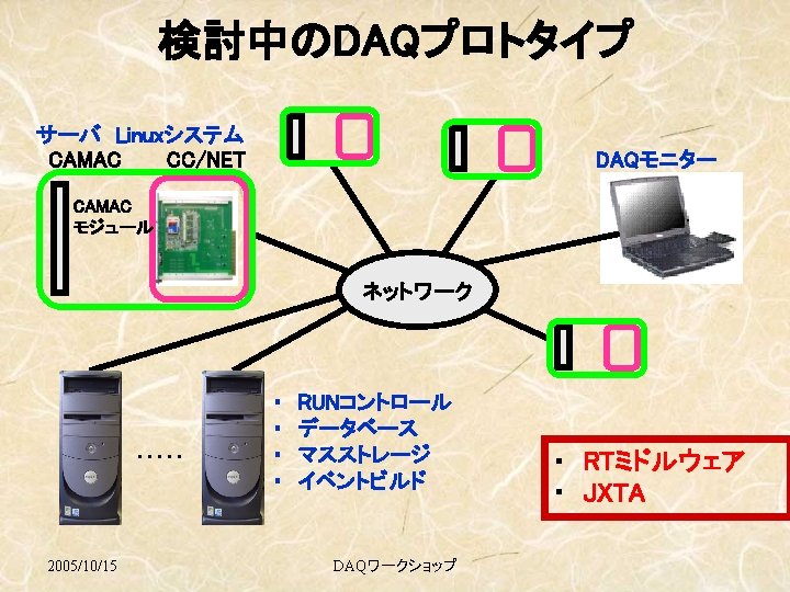 従来のDAQ資産について - データ収集システム構成法 COPPER Serial link interface (Network/USB/Firewire/Spacewire/…) PC Network PC TKO CAMAC 2005/10/15 VICTOR/VME-CPU SCH/SMP/VME-CPU Back-end PC Ethernet To Data server Network based Event Builder Local Storage CC/NETはネットワーク対応の camacコントローラ DAQワークショップ