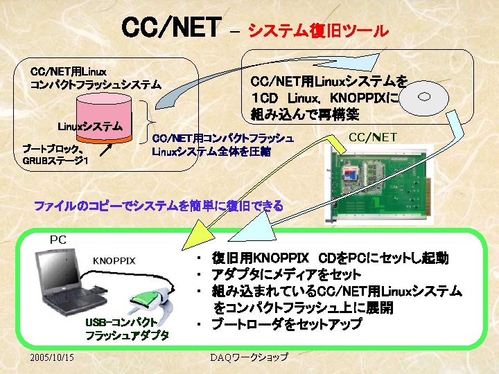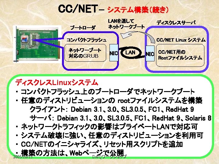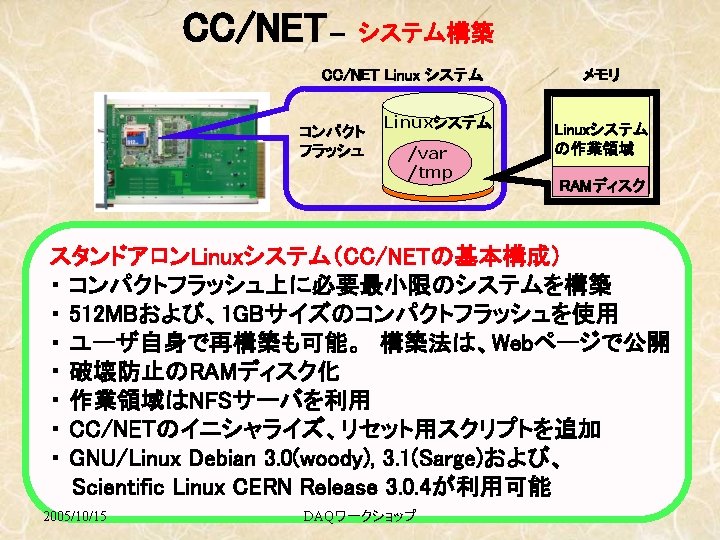 CC/NET - ドライバ/ライブラリ(続き) pccを自動的にロード。 システムアップで、CPU LEDが点滅か ら点燈に変わる。 システムダウンで点燈から点滅に変わる。 insmodコマンド モジュール組み込み rmmodコマンド モジュール解放 アプリケーション exam 0, exam 2, exam 4, web 3 exam 1 exam 3 exam 5 デバイスドライバ(カーネルモジュール) カーネルのバージョンは2.4 open read デバイスファイル write close /dev/pcc 0 init_module() cleanup_module() : : Pcc_open(), pcc_close(), pcc_read(), pcc_write(), pcc_interrupt() Pcc_ioctl() PCCIOC_TMP, PCCIOC_RESET, PCCIOC_CLEAR_FIFO, PCCIOC_PUT_DATA, PCCIOC_GET_DATA, PCCIOC_EXEC_PIO, PCCIOC_KICK_READ, PCCIOC_DISABLE_INTERRUP, PCCIOC_ENABLE_INTERRUPT, PCCIOC_WAIT_INTERRUPT, PCCIOC_DUMP_REGISTER 2005/10/15 DAQワークショップ