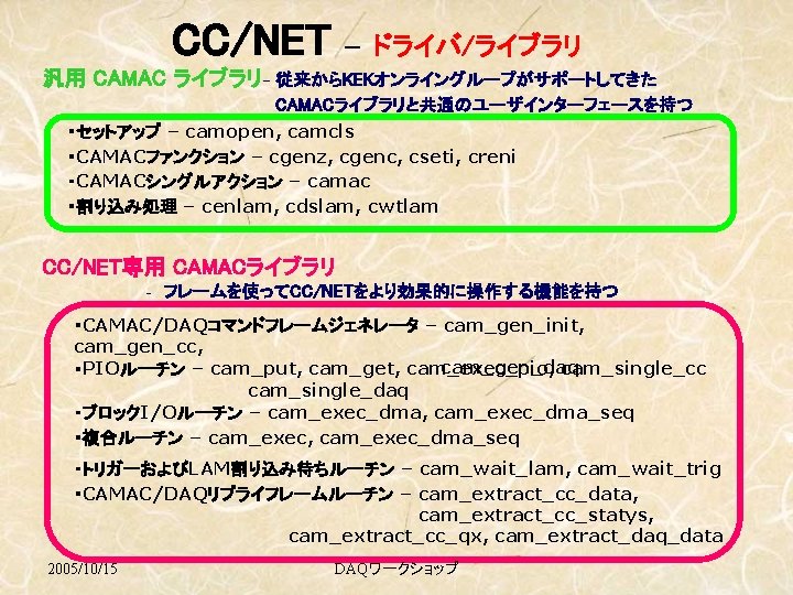 CC/NET関連のURL http: //www-online. kek. jp/~inoue/Parallel-CAMAC/index. html http: //www-online. kek. jp/~yasu/Parallel-CAMAC/index. html http: //www. toyo. co. jp/daq/index. html 2005/10/15 DAQワークショップ