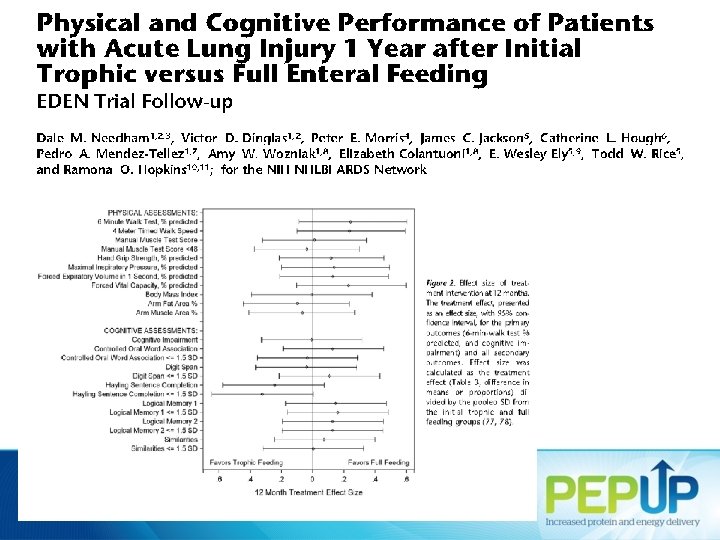 PEP u. P Trial Conclusion Statistically significant improvements in nutritional intake – Suboptimal effect related to suboptimal implementation Safe Acceptable Merits further use Can successfully be implemented in a broad range of ICUs in North America