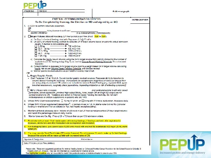 The Efficacy of Enhanced Protein-Energy Provision via the Enteral Route in Critically Ill Patients: The PEP u. P Protocol! Different feeding options based on hemodynamic stability and suitability for high volume intragastric feeds. In select patients, we start the EN immediately at goal rate, not at 25 ml/hr. We target a 24 hour volume of EN rather than an hourly rate and provide the nurse with the latitude to increase the hourly rate to make up the 24 hour volume. Start with a semi elemental solution, progress to polymeric. Motility agents and protein supplements are started immediately, rather than started when there is a problem. Tolerate higher GRV* threshold (300 ml or more). A major paradigm shift in how we feed enterally * GRV: gastric residual volume Heyland DK, et al. Crit Care. 2010; 14(2): R 78.
