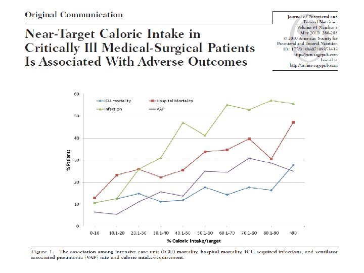 Optimal Amount of Calories for Critically Ill Patients: Depends on how you slice the cake! Association Between 12 -day Caloric Adequacy and 60 -day Hospital Mortality Optimal amount = 80 -85% Heyland DK, et al. Crit Care Med. 2011; 39(12): 2619 -26.