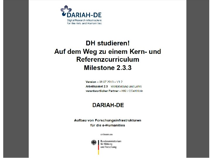 Was bisher geschah. . . • Vorbereitungstreffen in Köln 2009 / 2010 • Curricularaktivitäten als Task in DARIAH-DE • Broschüre „Digitale Geisteswissenschaften“ • Workshop / Panel in Hamburg, DH-Konferenz 2012 • Internationale Diskussion / Literatur • Empirische Datenerhebung • Report „DH-Studieren!“ • Curricularaktivitäten in DARIAH-EU, VCC 2