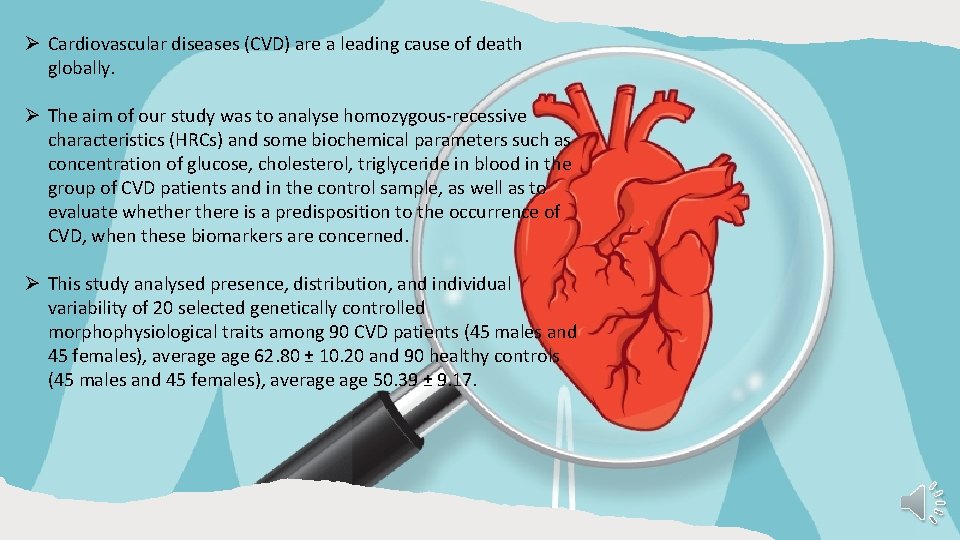Ø Cardiovascular diseases (CVD) are a leading cause of death globally. Ø The aim of our study was to analyse homozygous-recessive characteristics (HRCs) and some biochemical parameters such as concentration of glucose, cholesterol, triglyceride in blood in the group of CVD patients and in the control sample, as well as to evaluate whethere is a predisposition to the occurrence of CVD, when these biomarkers are concerned. Ø This study analysed presence, distribution, and individual variability of 20 selected genetically controlled morphophysiological traits among 90 CVD patients (45 males and 45 females), average 62. 80 ± 10. 20 and 90 healthy controls (45 males and 45 females), average 50. 39 ± 9. 17.