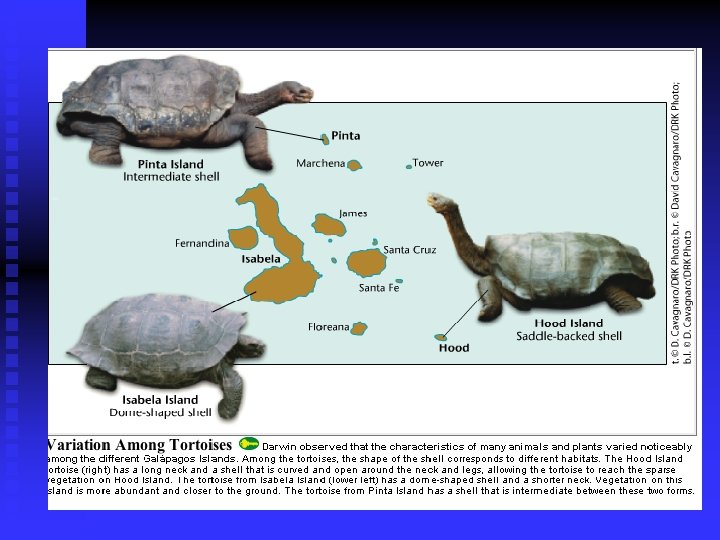 THE GALAPAGOS ISLAND n Darwin was fascinated in particular by the land tortoises and marine iguanas in the Galápagos. n Giant tortoises varied in predictable ways from one island to another. n The shape of a tortoise's shell could be used to identify which island a particular tortoise inhabited.