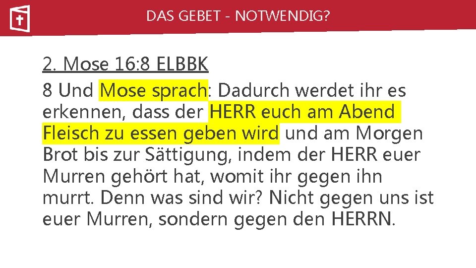DAS GEBET - NOTWENDIG? 2. Mose 16: 8 ELBBK 8 Und Mose sprach: Dadurch werdet ihr es erkennen, dass der HERR euch am Abend Fleisch zu essen geben wird und am Morgen Brot bis zur Sättigung, indem der HERR euer Murren gehört hat, womit ihr gegen ihn murrt. Denn was sind wir? Nicht gegen uns ist euer Murren, sondern gegen den HERRN.