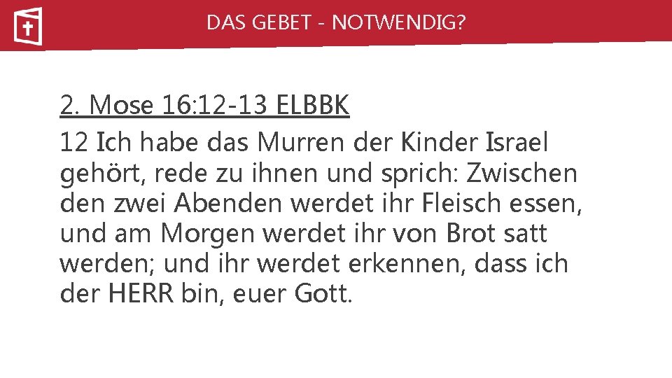 DAS GEBET - NOTWENDIG? 2. Mose 16: 12 -13 ELBBK 12 Ich habe das Murren der Kinder Israel gehört, rede zu ihnen und sprich: Zwischen den zwei Abenden werdet ihr Fleisch essen, und am Morgen werdet ihr von Brot satt werden; und ihr werdet erkennen, dass ich der HERR bin, euer Gott.