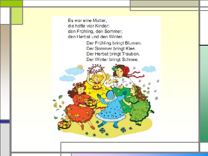 Es war eine Mutter, die hatte vier Kinder: den ____, den ______ und den ______. Der ____ bringt Blumen. Der ______ bringt Klee Der ______ bringt Trauben. Der ______ bringt Schnee.