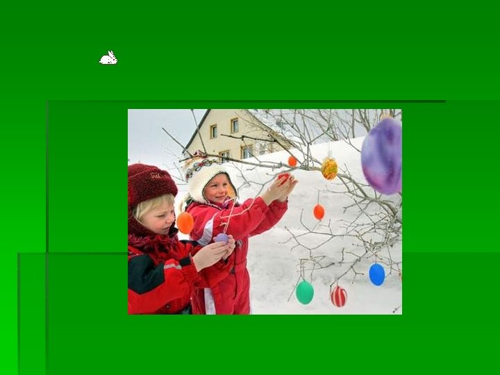 Osterhase und Ostereiersuchen § Nach der deutschen Tradition legen Hasen Eier, und zwar nicht vor die Haustür, sondern mitten in die Natur. Man versteckte die Ostereier unter Büschen und Bäumen und ließ die Kinder danach suchen. Und so geht man noch heute auf Ostereiersuche.