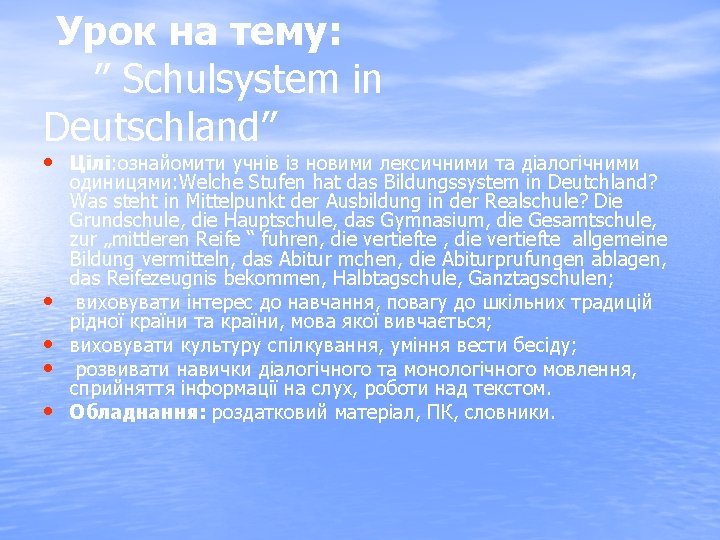 Sprichtwort • - Die Schule ist ein Schleifstein –школа джерело знань. • - Man wird alt wie eine Kuh und lernt immer mehr dazu- вік живи-вік учись.