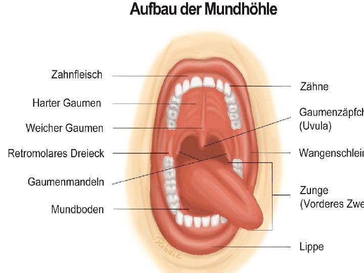 Die Mundhöhle Verdauung beginnt→ Mundhöhle: die Zähne zerkleinern die aufgenommene Nahrung Über 3 vers. Speicheldrüsen→ Speichel dazu Zunge→ durchmischt und formt Kehldeckel verschließt→ Luftröhre (beim Schlucken) → sodass keine Nahrung in sie gelangen kann
