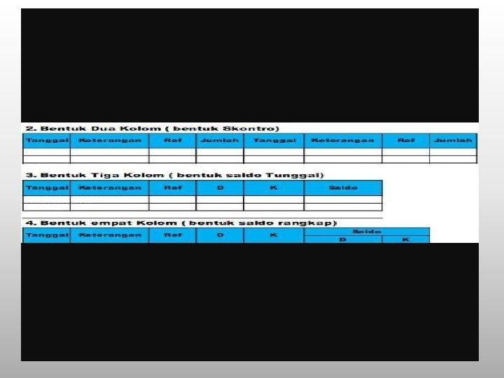 Bentuk Staffle Berkolom saldo tunggal Bentuk Staffle berkolom saldo tunggal dalam buku besar akuntansi ialah bentuk buku yang digunakan jika diperlukan penjelasan dari transaksi yang relatif banyak. Bentuk staffle berkolom saldo rangkap dalam buku besar akuntansi ialah bentuk buku yang hampir sama dengan bentuk kolom saldo tunggal. Hanya perbedaannnya dalam buku ini kolom saldo dibagi dua kolom yakni kolom debit dan kolom kredit