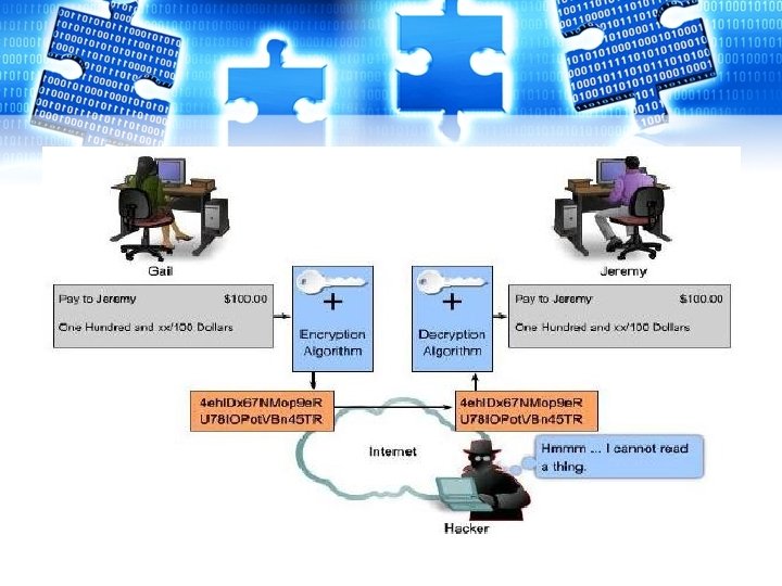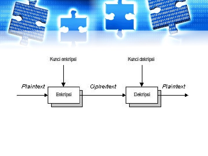 • Enkripsi (encryption) Proses yang dilakukan untuk mengamankan sebuah pesan (plaintext) menjadi pesan yang tersembunyi (ciphertext). • Dekripsi (decryption) Proses sebaliknya, untuk mengubah ciphertext menjadi plaintext.
