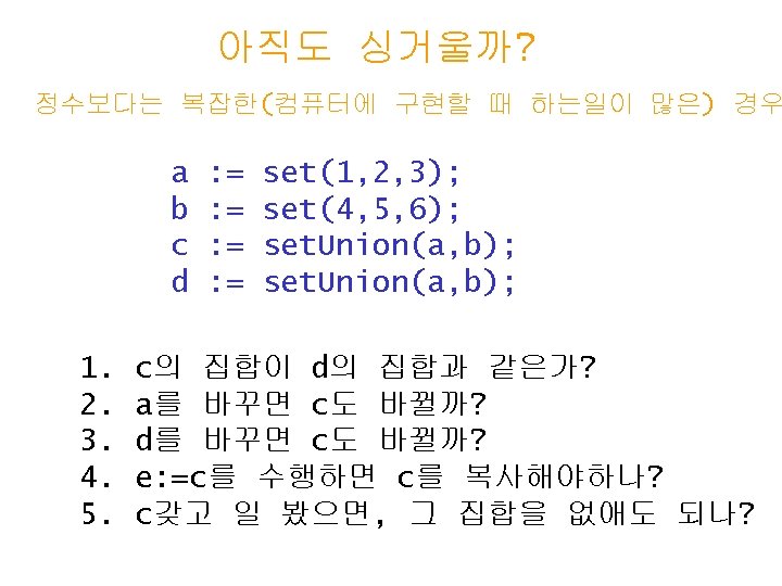 abstraction: 자세한 속사정을 감춘다는 의미 - fixed interface - implementation/representation-independence Types are “the” language of interface Abstraction example: functional abstraction - fixed interface: name and its type - implementation-independence add(x, y) sort(a)