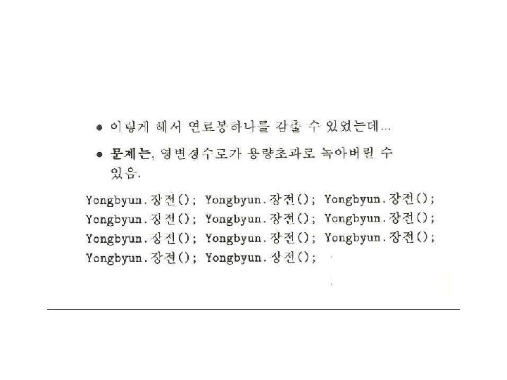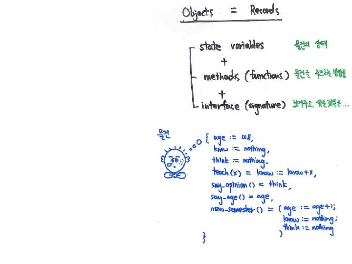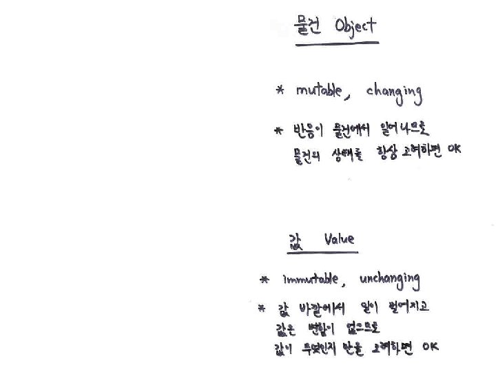 Object-Oriented Programming v. s. Value-Oriented Programming imperative v. s. applicative 물건중심 기계중심 명령형 객체지향 값중심 생각중심 함수형 Two representative programming paradigms. What are they?