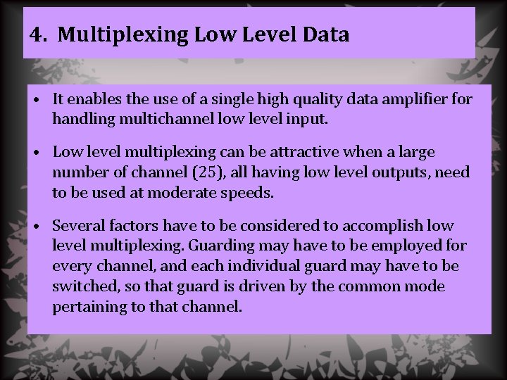 4. Multiplexing Low Level Data • It enables the use of a single high quality data amplifier for handling multichannel low level input. • Low level multiplexing can be attractive when a large number of channel (25), all having low level outputs, need to be used at moderate speeds. • Several factors have to be considered to accomplish low level multiplexing. Guarding may have to be employed for every channel, and each individual guard may have to be switched, so that guard is driven by the common mode pertaining to that channel.