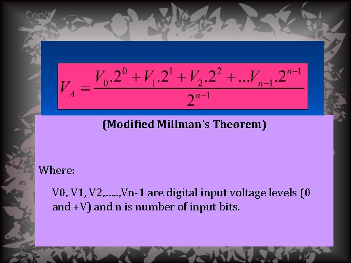 Con’t (Modified Millman’s Theorem) Where: V 0, V 1, V 2, …. . , Vn-1 are digital input voltage levels (0 and +V) and n is number of input bits.