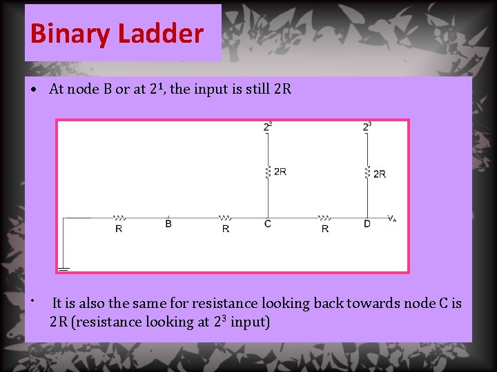 Binary Ladder • At node B or at 21, the input is still 2 R • It is also the same for resistance looking back towards node C is 2 R (resistance looking at 23 input)