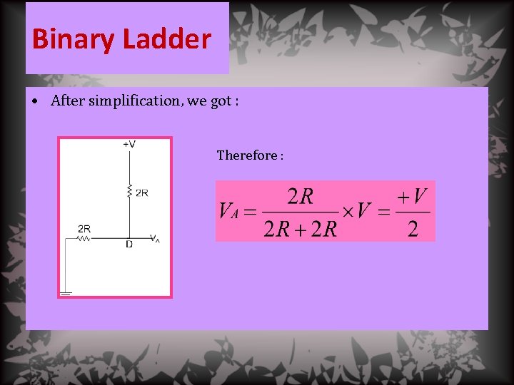 Binary Ladder • After simplification, we got : Therefore: • This process can be continued, and it can be shown that the 3 rd MSB gives an output voltage of +V/8, the 4 th MSB gives an output voltage of +V/16 and so on.