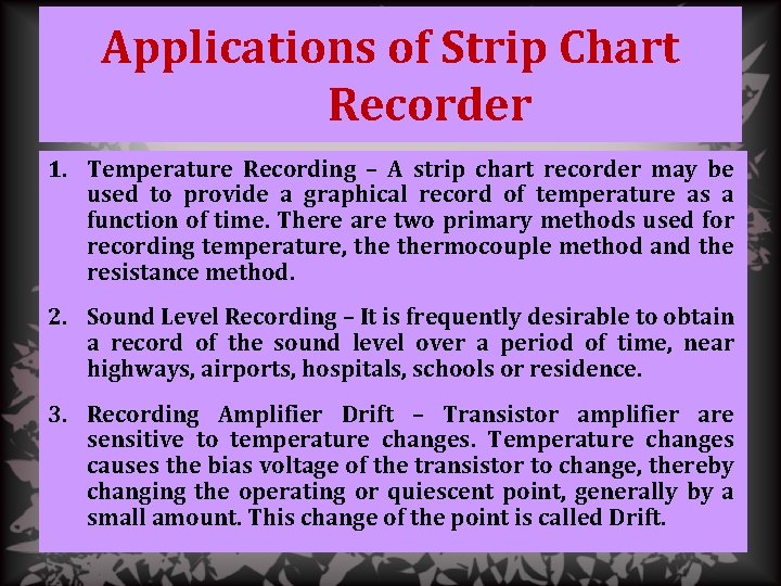 Applications of Strip Chart Recorder 1. Temperature Recording – A strip chart recorder may be used to provide a graphical record of temperature as a function of time. There are two primary methods used for recording temperature, thermocouple method and the resistance method. 2. Sound Level Recording – It is frequently desirable to obtain a record of the sound level over a period of time, near highways, airports, hospitals, schools or residence. 3. Recording Amplifier Drift – Transistor amplifier are sensitive to temperature changes. Temperature changes causes the bias voltage of the transistor to change, thereby changing the operating or quiescent point, generally by a small amount. This change of the point is called Drift.