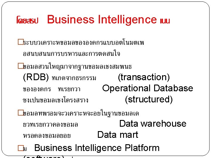 Business Intelligence http: //en. wikipedia. org/wiki/Business_intelligence �computer-based techniques used in 28 spotting, digging-out, and analyzing business data �BI technologies provide historical, current, and predictive views of business operations �Common functions of business intelligence technologies are reporting, online analytical processing, analytics, data mining �Business intelligence aims to support