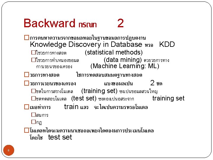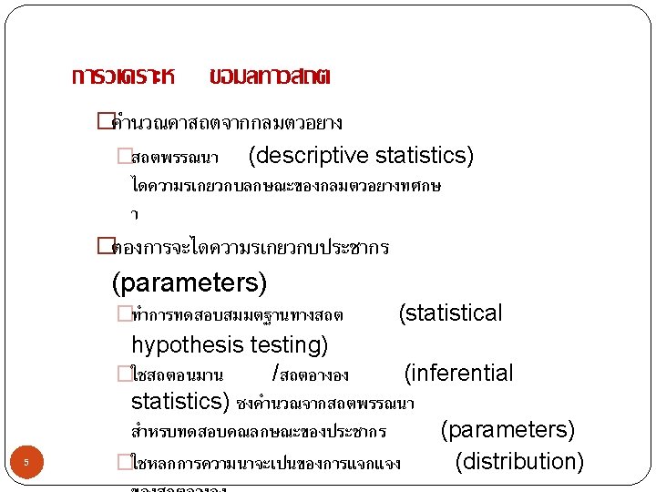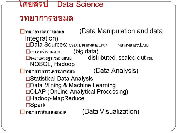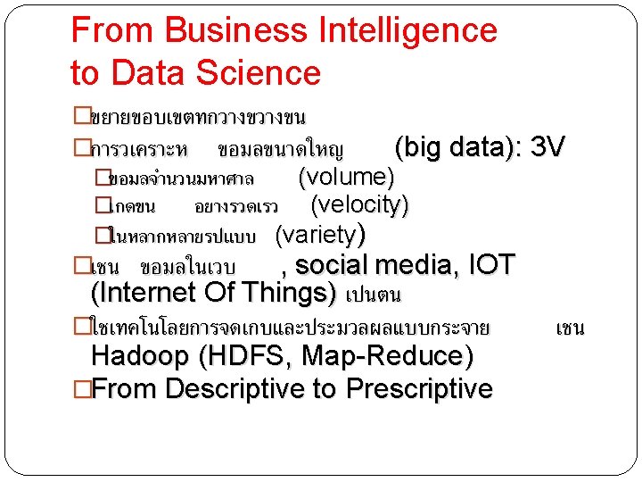 Data Analytics: Statistical Methods, Data Mining, Business Intelligence, Data Science สณ 1 รกษาเกยรตศกด sunee@g. swu. ac. th