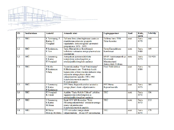 ESTA-s säilitatakse Eestis korraldatud uurimuste materjale: • uurimisaruandeid, • täidetud ankeete, • kodeerimislehti, • statistilise andmetöötluse väljatrükke, andmeanalüüsi tulemuste käsikirjalisi kokkuvõtteid jne
