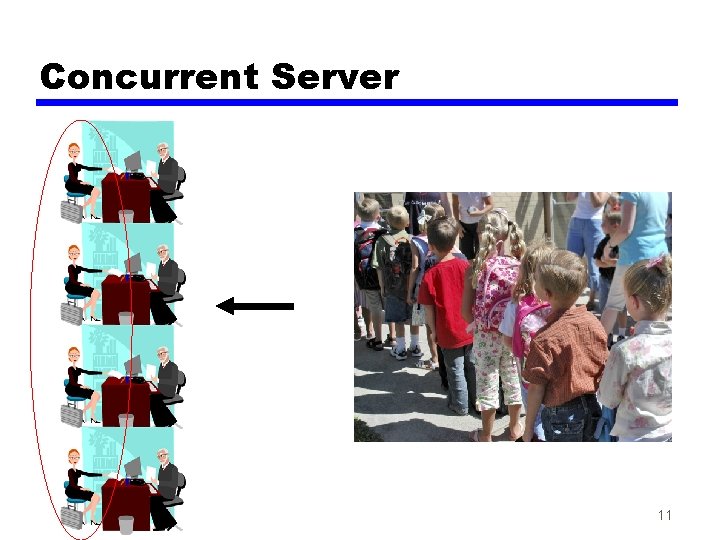 Server Design Issues (Cont. ) • Iterative vs. concurrent —Iterative server handles one request at a time. —If another request arrives while the server is busy handling an existing request, the new request has to wait. • Iterative servers are easier to design, implement, and maintain. • Iterative server is not good for a service with a long “request processing time”. —Concurrent server handles multiple requests concurrently. • It can decrease the response time. • It can achieve high performance on a server with multiple processors. • It can achieve high performance by overlapping processing and I/O. 9