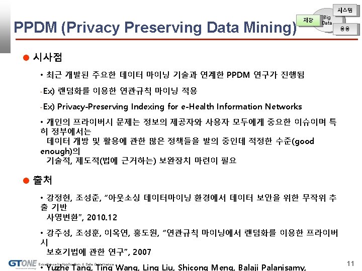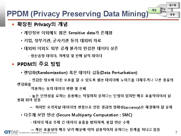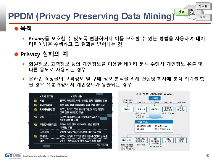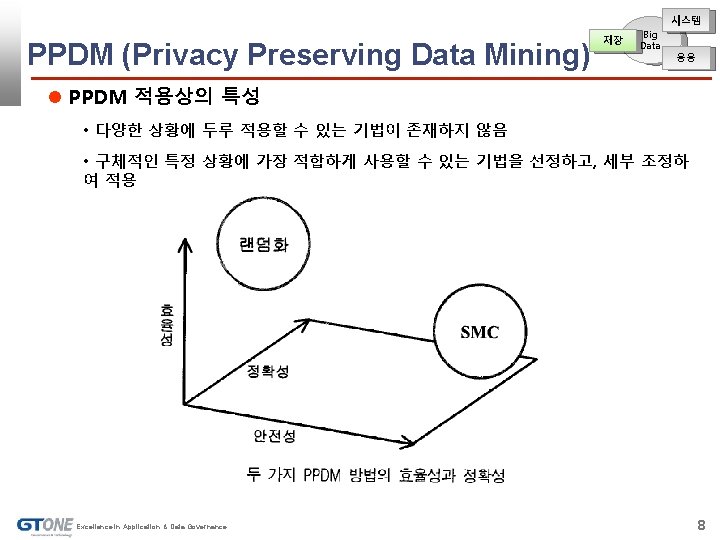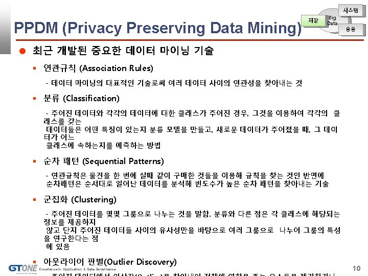 시스템 PPDM (Privacy Preserving Data Mining) 저장 Big Data 응용 기존의 데이터마이닝 방법 오리지널 데이터의 분포 추정 과정 Excellence in Application & Data Governance 9