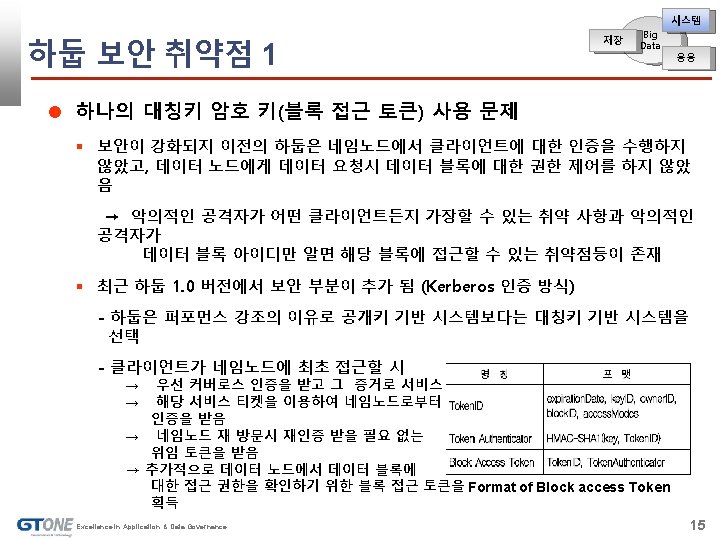 시스템 하둡 보안 취약점 2 저장 Big Data 응용 하둡 보안 도입시 검토 대상 Job Control – Dose nothing to prevent malicious users from causing harm (weak authentication) Is not support encryption on the wire and encryption on disk Is not protect DOS attacks Is not support edge authentication (eg, PKI, SAML) Is not easy to setting up Hadoop Security System 새로운 하둡 컴포넌트 도입시 하둡 보안을 지원하는 컴포넌트로 구성해야 함 Excellence in Application & Data Governance 18