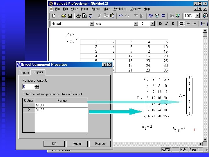 Inserting the Excel worksheets A range of Excel cells can be inserted into the Math. CAD n There can be more then one range in single insertion n One variable is being assigned to one range n All variables forms a vector n Cells can contain numbers as well as text (in contrast to table and text files, ver. 2001) n Worksheets can be edited (double-click) using all Excel functions (object embedded -Excel has to be installed in system). n